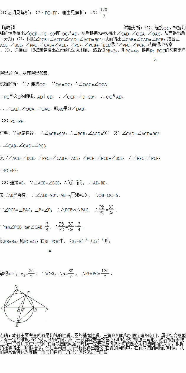 如图,AB是⊙O的直径,点C是⊙O上一点,AD和过点C的切线互相垂直,垂足为D,直线DC与AB的延长线相交于P.弦CE平分∠ACB,交直径AB于点F,连结BE.