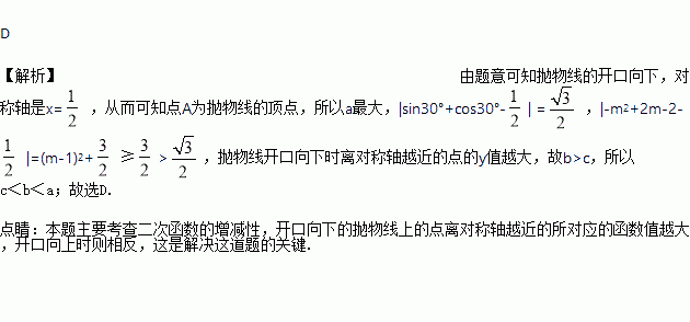 ,a),B(sin30°+cos30°,b), C(-m2+2m-2,c)都在二次函数y=-x2+x+3的图象上,那么a、b、c的大小关系是( )