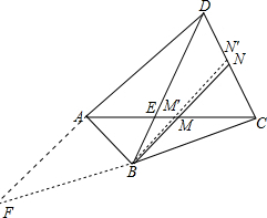 分析 延长DA、CB交于点F,如图,设S△ABC=S,则,S△ABD=3S,S△BCD=4S.根据高相等时面积比等于底的比可得$\frac{{S}_{△AFB}}{{S}_{△ABC}}$=$\frac{FB}{BC}$=$\frac{{S}_{△DFB}}{{S}_{△DBC}}$,从而可得S△AFB=S=S△ABC,则有FB=BC.过点B作DF的平行线,交AC于M′,交DC于N′,根据平行线分线段成比例可得:AM′=CM′,DN′=N′C.然后分三种情况讨论(①点M′在点M的左侧,②点M′在点M的右侧,③点M′与点M重合),运用反证法就可解决问题.