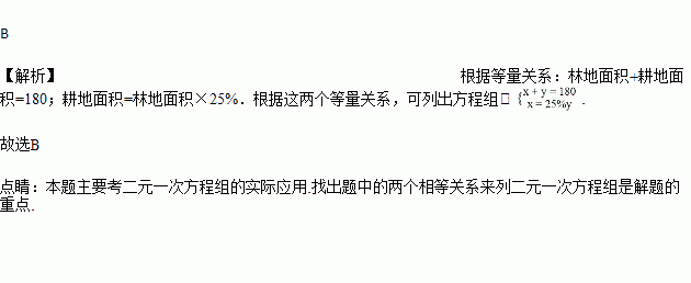 为保护生态环境,陕西省某县响应国家“退耕还林”号召,将某一部分耕地改为林地,改变后,林地面积和耕地面积共有180平方千米,耕地面积是林地面积的25%,求改变后林地面积和耕地面积各多少平方千米.设改变后耕地面积x平方千米,林地地面积y平方千米,根据题意,列出如下四个方程组,其中正确的是( )