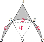 分析:如图,取BC的中点O,连接OD、OE、DE.利用三角形中位线定理和等边三角形的判定得到△OBD、△ODE、△OEC均为等边三角形.如图所示,阴影①、③和空白②的面积是相等的,先将阴影①移到空白②的位置,则△ADE的面积就等于④的面积,再将阴影③移到空白②的位置,则三个阴影部分的面积就等于扇形DOE的面积,也就是半圆的面积的