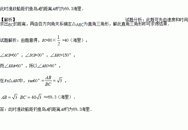 (10分)如图,我国渔政船在钓鱼岛海域C处测得钓鱼岛A在渔政船的北偏西30。的方向上,随后渔政船以80海里/小时的速度向北偏东30°的方向航行,半小时后到达B处,此时又测得钓鱼岛A在渔政船的北偏西60°的方向上,求此时渔政船距钓鱼岛A的距离姓B.(结果保留小数点后一位,其中