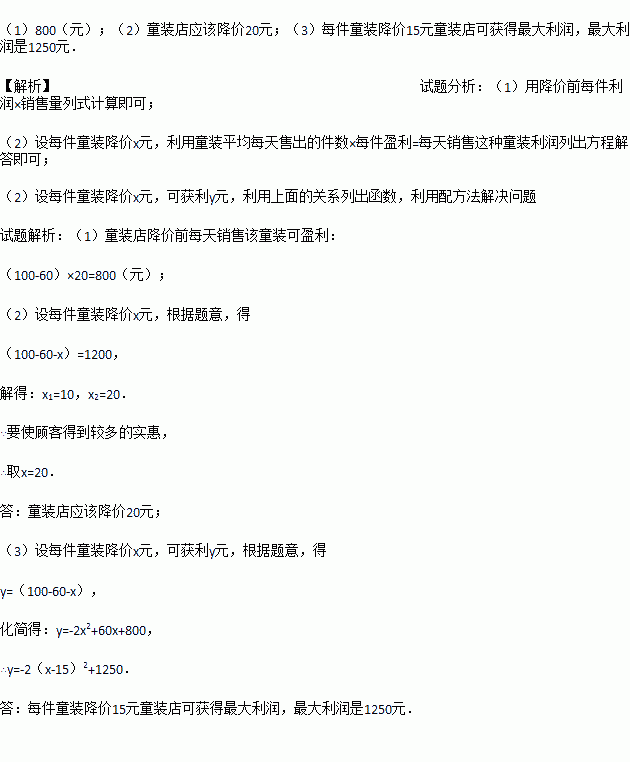 (1)如果童装店想每天销售这种童装盈利1200元,同时又要使顾客得到更多的实惠,那么每件童装应降价多少元?