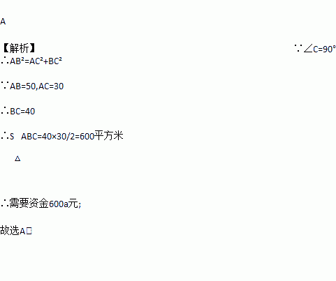 △ABC是某市在拆除违章建筑后的一块三角形空地.已知∠C=90°,AC=30米,AB=50米,如果要在这块空地上种植草皮,按每平方米草皮a元计算,那么共需要资金( ).