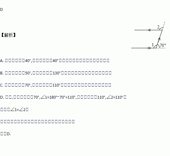 C. 第一次向左拐70°,第二次向右拐110° D. 第一次向左拐70°,第二次向左拐110°