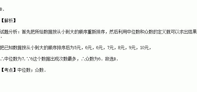 某学习小组7位同学,为玉树地重灾区捐款,捐款金额分别为:5元,10元,6元,6元,7元,8元,9元,则这组数据的中位数与众数分别为( )