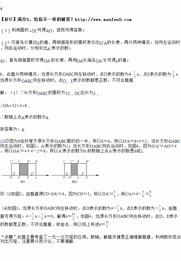 如图1,长方形OABC的边OA在数轴上,O为原点,长方形OABC的面积为12,OC边长为3.