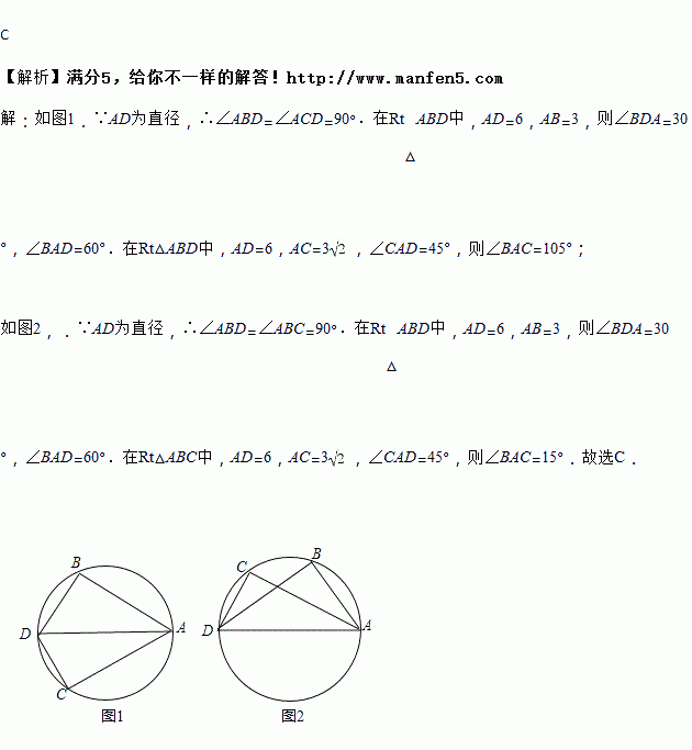 A. 15° B. 75°或15° C. 105°或15° D. 75°或105°