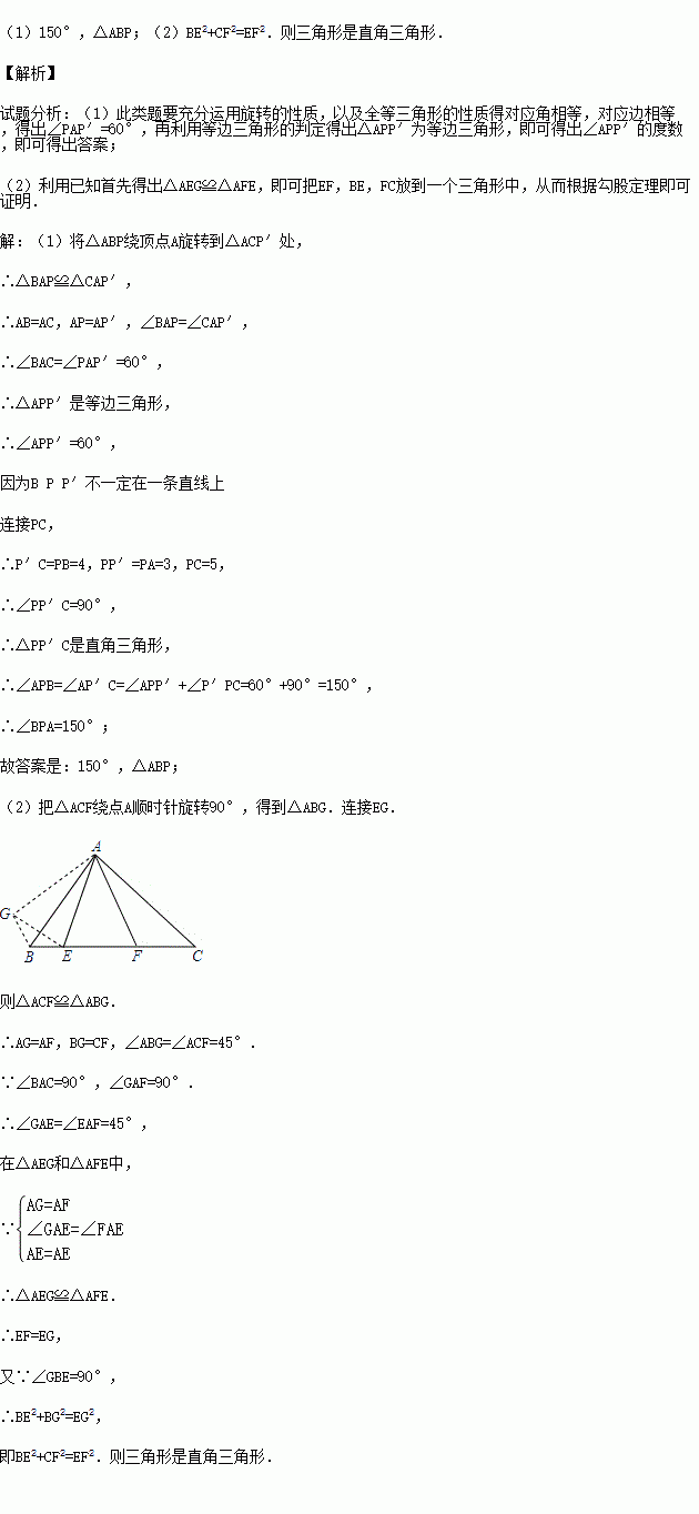 (2)请你利用第(1)题的解答思想方法,解答下面问题:已知如图(2),△ABC中,∠CAB=90°,AB=AC,E、F为BC上的点且∠EAF=45°,试猜想分别以线段BE、EF、CF为边能构成一个三角形吗?若能,试判断这个三角形的形状.