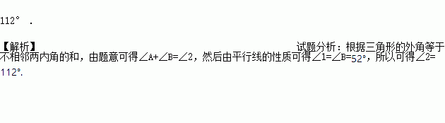 如图:△ABC中,点D、E分别是AB、AC上的点,点F在BC的延长线上,DE∥BC,∠A=60°,∠1=52°,则∠2=_________ .