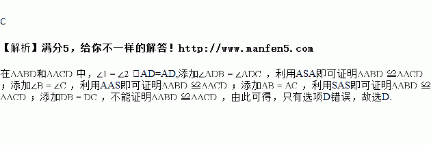 如图,已知∠1=∠2,欲证△ABD≌△ACD,还需从下列条件中补选一个,则错误的是( )