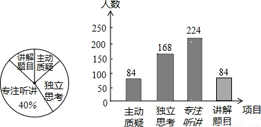 (2)用被抽查的学生人数减去主动质疑、独立思考、专注听讲的人数,求出讲解题目的人数,然后补全统计图即可;