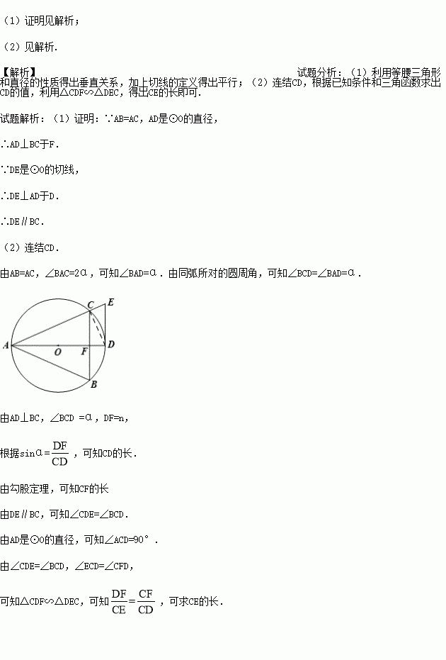 (2)若DF=n,∠BAC=2α,写出求CE长的思路.