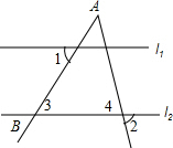 解答 解:∵l1∥l2,∴∠3=∠1=60°,∵∠A=40°,∴∠4=180°-∠A-∠3=80°,∴∠2=∠4=80°;故答案为:80°.
