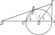 分析 (1)证明:连结OB,如图,根据平行线的性质,由CB∥OP得到∠1=∠3,∠2=∠4,加上∠3=∠4,则∠1=∠2,则可证明△POB≌△POA,得到∠PBO=∠PAO=90°,然后根据切线的性质可判断PD为圆O的切线;