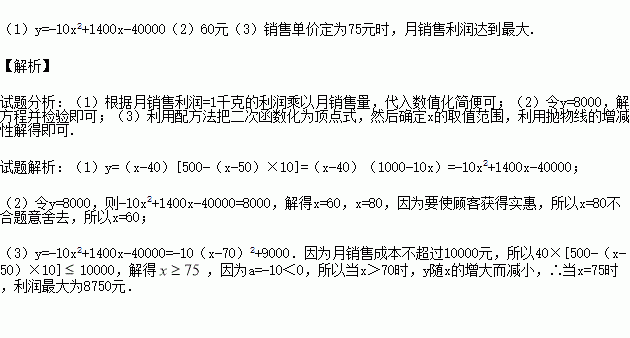 (1)设销售单价为每千克x元,月销售利润为y元,求y与x的函数关系式;