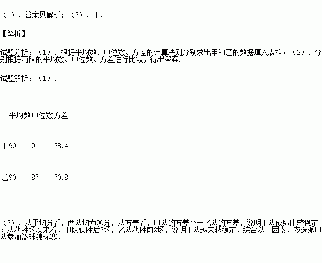 (2)、如果从两队中选派一支球队参加篮球锦标赛,根据上述统计,从平均分、方差以及获胜场数这三个方面分别进行简要分析,你认为选派哪支球队参赛更能取得好成绩?