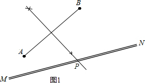 分析:(1)连接AB,作线段AB的垂直平分线交MN于点P,则点P即为所求;