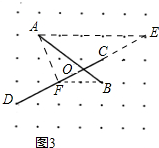 (3)如图,连接AE、BF,则AF=$\sqrt{5}$,AB=$\sqrt{13}$,由△AOE∽△BOF,可以求出AO=$\frac{5\sqrt{13}}{7}$,在Rt△AOF中,可以求出OF=$\frac{4\sqrt{5}}{7}$,故可求得tan∠AOD.