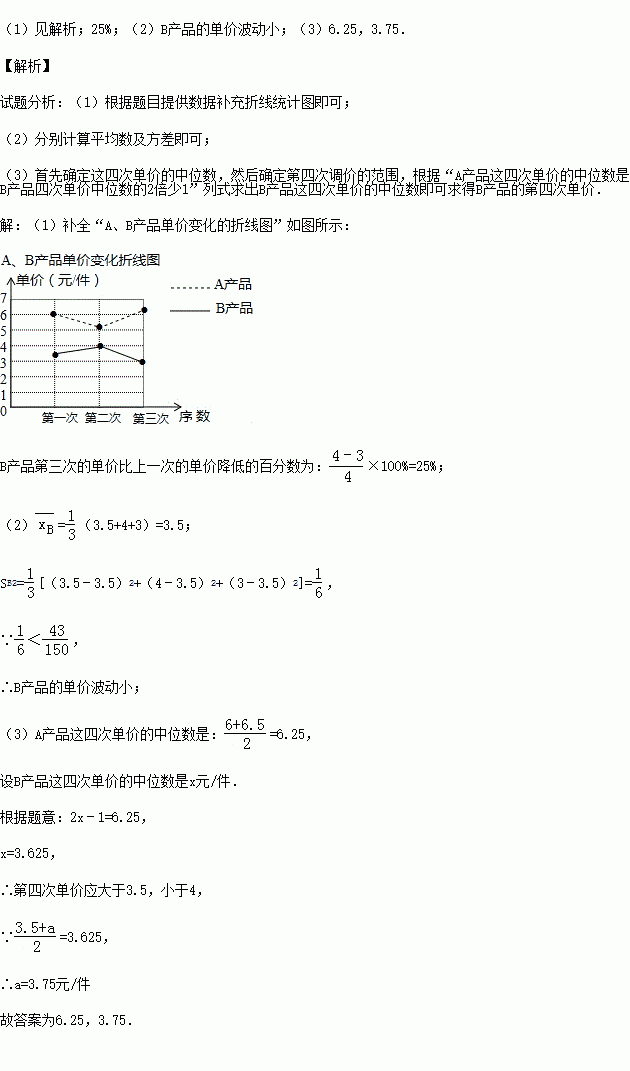 (1)补全“A、B产品单价变化的折线图”,B产品第三次的单价比上一次的单价降低了百分之多少?