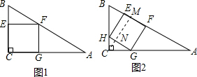 分析 先利用勾股定理计算出AC=4,对于方案一:如图1,设正方形CGFE的边长为x,则BE=3-x,证明△BEF∽△BCA,利用相似比可计算出x=$\frac{12}{7}$;对于方案二:如图2,设正方形HGFE的边长为y,作CM⊥AB于M,交HG于N,利用面积法计算出CM=$\frac{12}{5}$,再证明△CHG∽△CBA,利用相似比可计算出y=$\frac{60}{37}$,然后比较x和y的大小即可判断哪种方案能裁出面积最大的正方形铁片.
