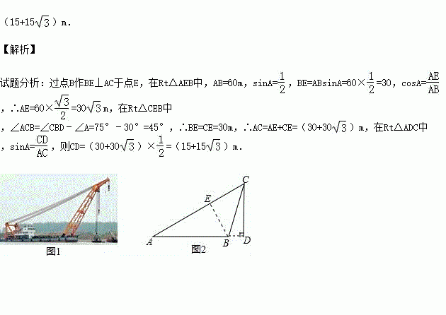 如图1是“东方之星”救援打捞现场图,小红据此构造出一个如图2所示的数学模型,已知:A、B、D三点在同一水平线上,CD⊥AD,∠A=30°,∠CBD=75°,AB=60m.