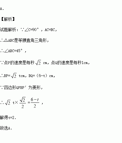 cm的速度向终点A运动;同时,动点Q从点C出发沿CB方向以每秒1cm的速度向终点B运动,将△BPQ沿BC翻折,点P的对应点为点P′.设Q点运动的时间t秒,若四边形QPBP′为菱形,则t的值为( )