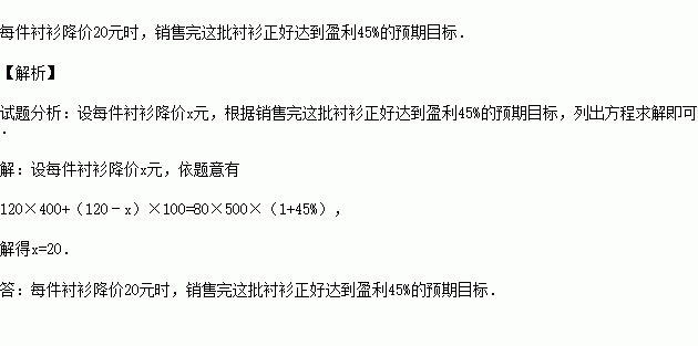 (2015•泰州)某校七年级社会实践小组去商场调查商品销售情况,了解到该商场以每件80元的价格购进了某品牌衬衫500件,并以每件120元的价格销售了400件,商场准备采取促销措施,将剩下的衬衫降价销售.请你帮商场计算一下,每件衬衫降价多少元时,销售完这批衬衫正好达到盈利45%的预期目标?
