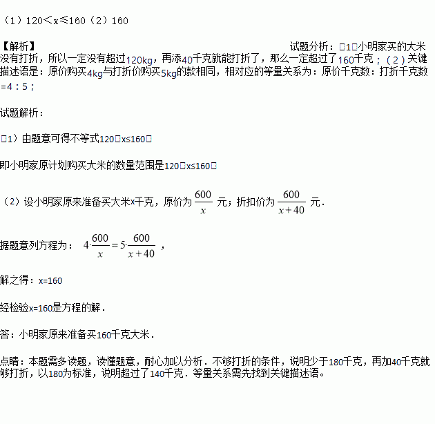 某超市规定:凡一次购买大米160kg以上可以按原价打折出售,购买160kg(包括160kg)以下只能按原价出售.小明家到超市买大米,原计划买的大米,只能按原价付款,需要600元;若多买40kg,则按打折价格付款,恰巧需要也是600元.