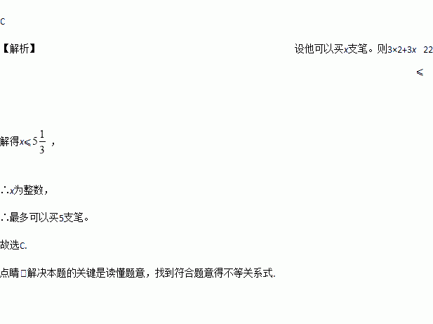 小明准备用22元钱买笔和笔记本,已知每支笔3元,每本笔记本2元,他买了3本笔记本后,其余的钱用来买笔,那么他最多可以买( )