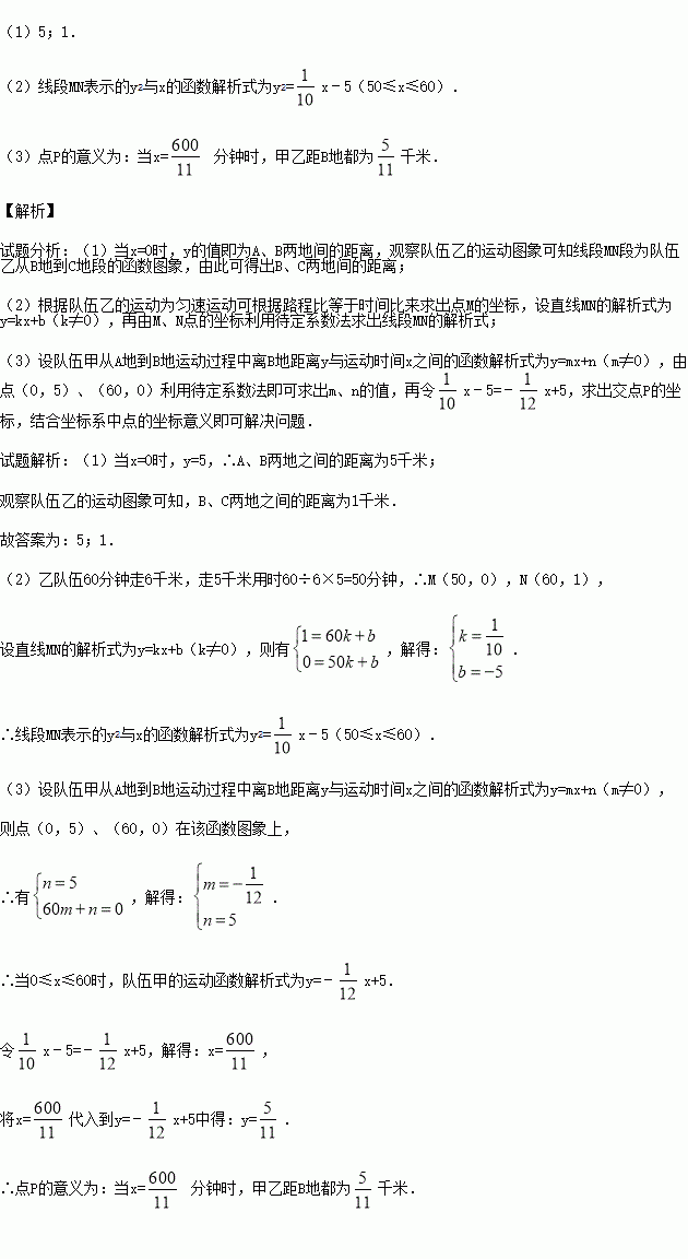 (2)求队伍乙由A地出发首次到达B地所用的时间,并确定线段MN表示的y2与x的函数关系式;