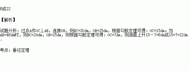 如图是一个汽油桶的截面图,其上方有一个进油孔,该汽油桶的截面直径为50dm,此时汽油桶内液面宽度AB=40dm,现在从进油孔处倒油,当液面AB=48dm时,液面上升了__________dm.