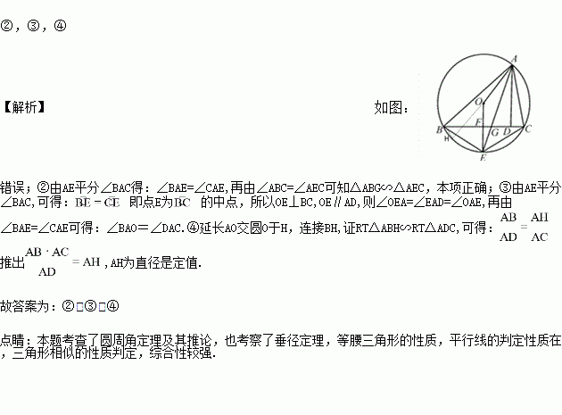 如图,△ABC是定圆O的内接三角形,AD为△ABC的高线,AE平分∠BAC交⊙O于E,交BC于G,连OE交BC于F,连OA,在下列结论中, ①CE=2EF,②△ABG∽△AEC,③∠BAO=∠DAC,④