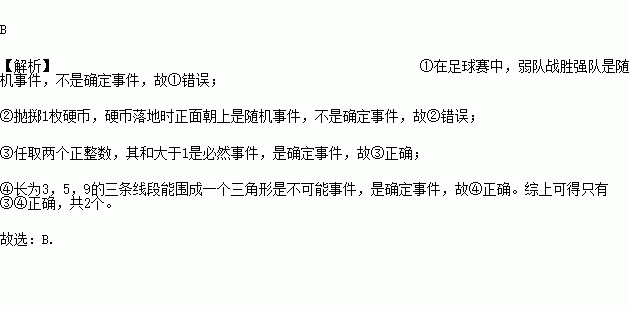 下列事件:①在足球赛中,弱队战胜强队;②抛掷一枚硬币,硬币落地时正面朝上;③任取两个正整数,其和大于1;④长为3,5,9的三条线段能围成一个三角形。其中确定事件有( )