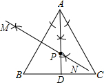 △ABC中,AB=AC,利用尺规作AB边上的垂直平分线MN与∠BAC的角平分线AD,两线交于点P.(保留作图痕迹,不写作法)