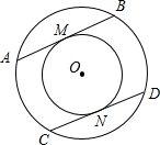 如图,以点O为圆心的两个同心圆中,大圆的弦AB、CD是小圆的两条切线,切点分别为M、N,那么AB、CD是否相等?为什么?