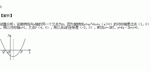如图,抛物线y=ax2+bx+c(a>0)的对称轴是过点(1,0)且平行于y轴的直线,若点P(4,0)在该抛物线上,则4a﹣2b+c的值为 .