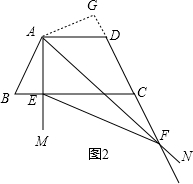 如图1,梯形ABCD中,AD∥BC,AB=AD=CD,∠BAD=120°,∠MAN=60°,将图1中的∠MAN绕点A按逆时针方向旋转角α,且0°<α<120°,边AM、AN分别交直线BC、CD于E、F两点.