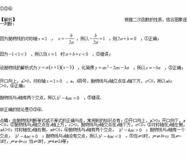 如图,二次函数y=ax2+bx+c(a>0)图象的顶点为D,其图象与x轴的交点A,B的横坐标分别为-1,3.与y轴负半轴交于点C,在下面五个结论中:①2a+b=0;②a+b+c>0;③c=-3a;④abc>0.⑤b2-4ac<0其中正确的结论是 .(只填序号)