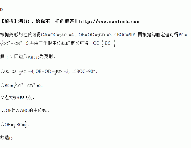 如图,菱形ABCD的对角线AC、BD相交于点O,AC=8,BD=6,点E为AB中点,连接OE,则OE的长是( )