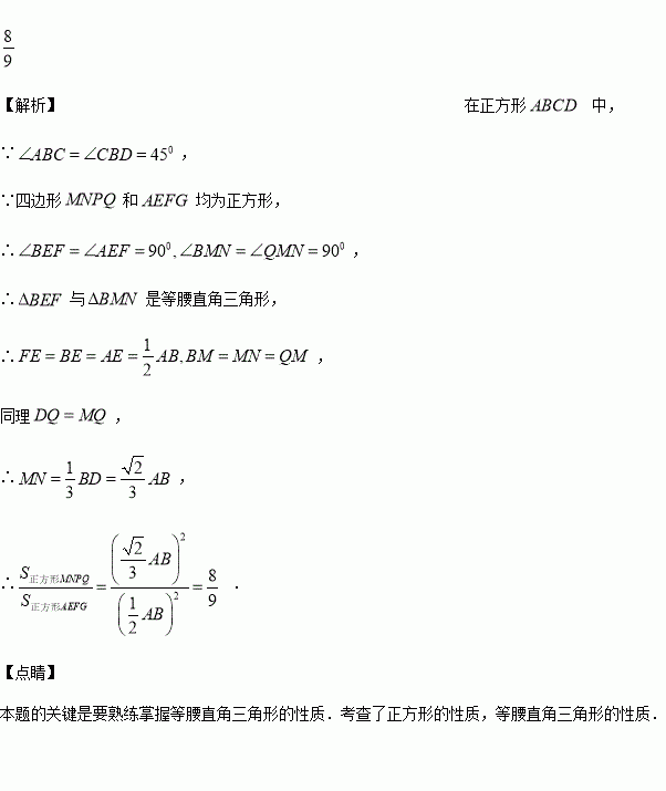 如图,在正方形ABCD中,点E,N,P,G分别在边AB,BC,CD,DA上,点M,F,Q都在对角线BD上,且四边形MNPQ和AEFG均为正方形,则正方形MNPQ与正方形AEFG的面积之比等于________。