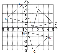 分析 (1)利用网格特点和旋转的性质,画出点A、B、C的对应点A1、B1、C1,即可得到△A1B1C1;(2)利用关于原点对称的点的坐标特征写出点A1、B1、C1的对称点A2、B2、C2的坐标,然后描点即可得到△A2B2C2.