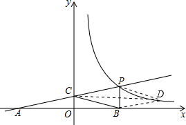 (3)假设存在这样的D点,使四边形BCPD为菱形,如图所示,由一次函数解析式求出C坐标,得出直线BC斜率,求出过P且与BC平行的直线PD解析式,与反比例解析式联立求出D坐标,检验得到四边形BCPD为菱形,符合题意.