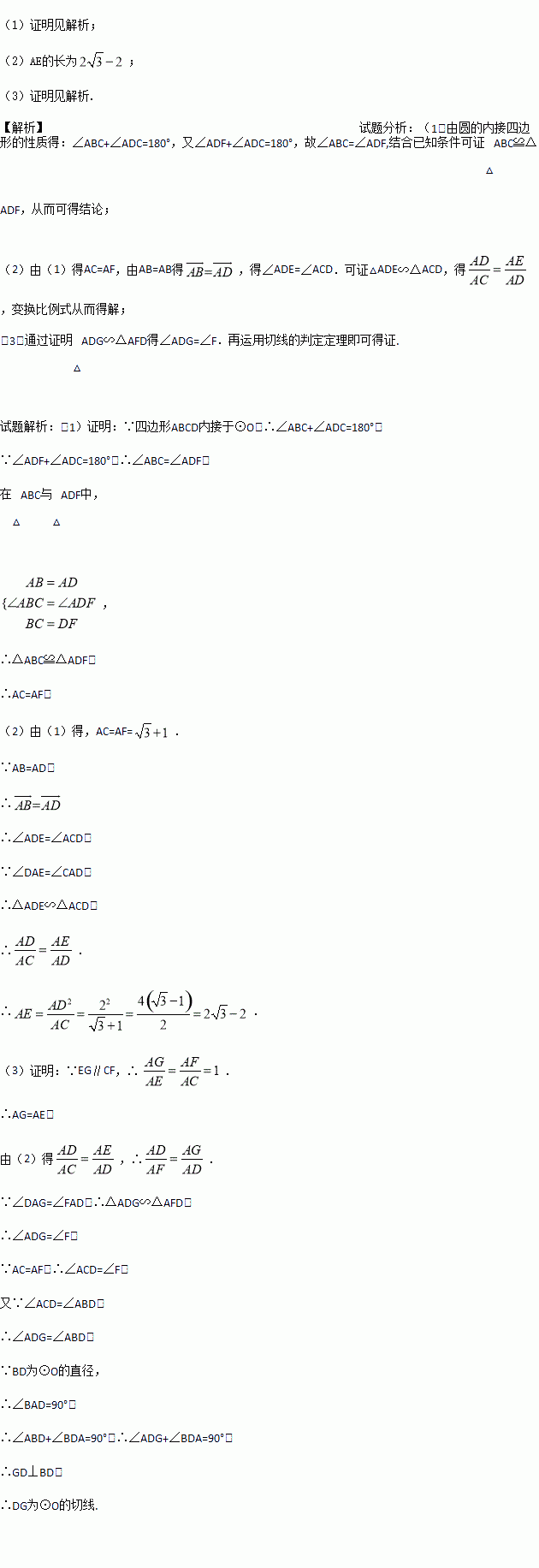(3)若EG∥CF交AF于点G,连接DG.证明:DG为⊙O的切线.