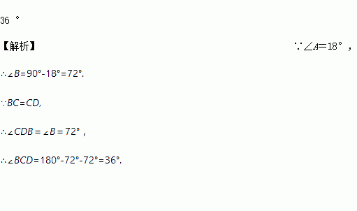 如图,在Rt△ABC中,∠ACB=90°,∠A=18°,将△ABC绕点C按顺时针方向旋转后得到△EDC, 此时点D在AB边上,则旋转角的大小为__________.