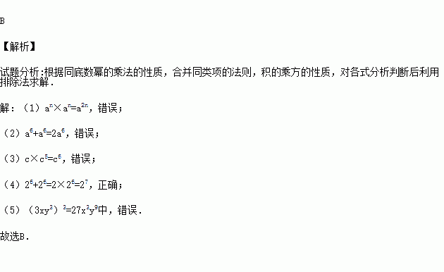 下列计算:(1)an×an=2an,(2)a6+a6=a12,(3)c×c5=c5,(4)26+26=27,(5)(3xy3)3=9x3y9中,正确的个数为( )