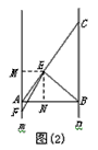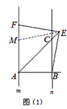 | (2)EF= 过点E作EM⊥m,EN⊥AB,垂足为M,N, ∴∠EMF=∠ENA=90°, ∵m∥n,∠ABC=90°, ∴∠MAB=90°, ∴四边形MENA为矩形, ∴ME=NA,∠MEN=90°, ∵∠BEF=∠ABC=90°, ∴∠MEF=∠NEB, ∴△MEF∽△NEB, ∴ ∴ 在Rt△ANE和Rt△ABC中, ∴EF= |