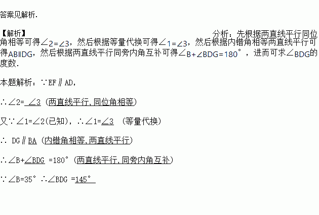 如图,EF∥AD,∠1=∠2,∠B=35°,将求∠BDG的过程填写完整。