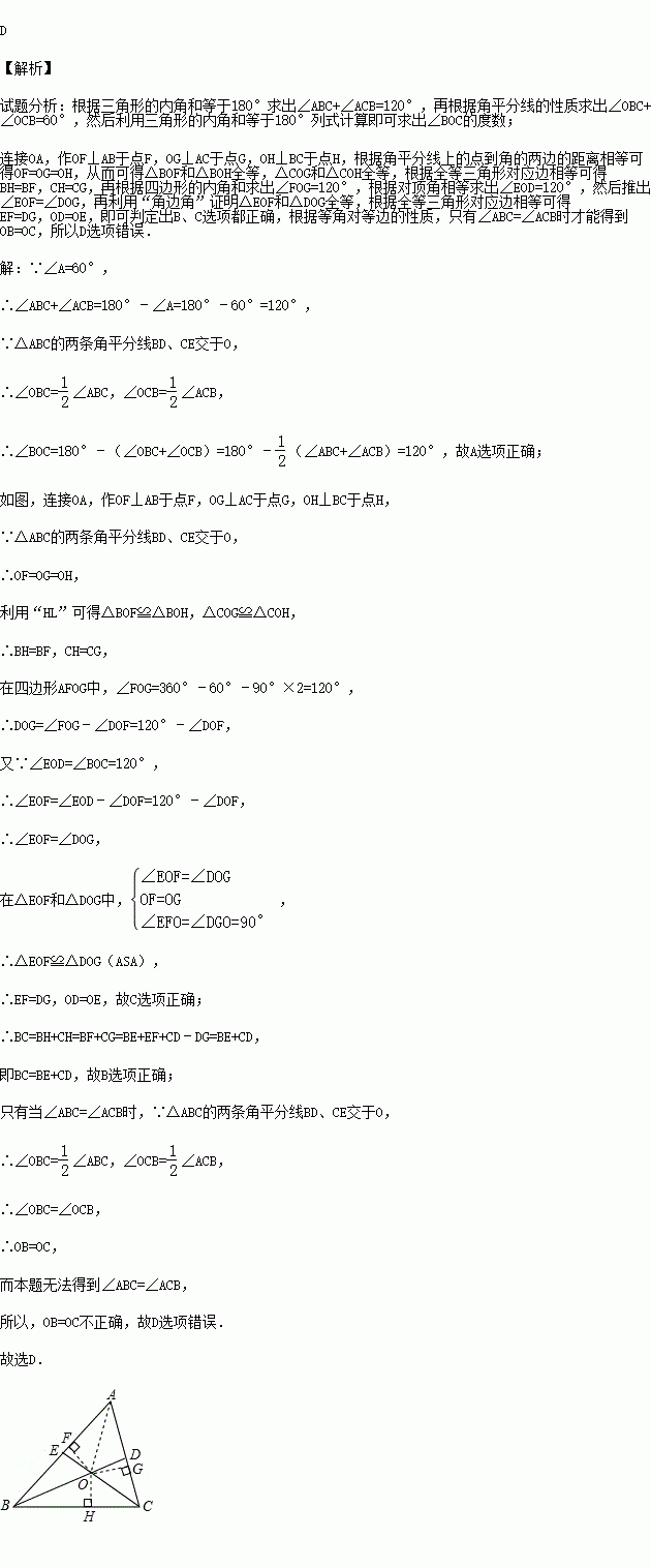 (2015秋•孝感月考)如图,△ABC的两条角平分线BD、CE交于O,且∠A=60°,则下列结论中不正确的是( )