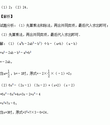 (2)6x2﹣(2x﹣1)(3x﹣2)+(x+2)(x﹣2),其中x=3.